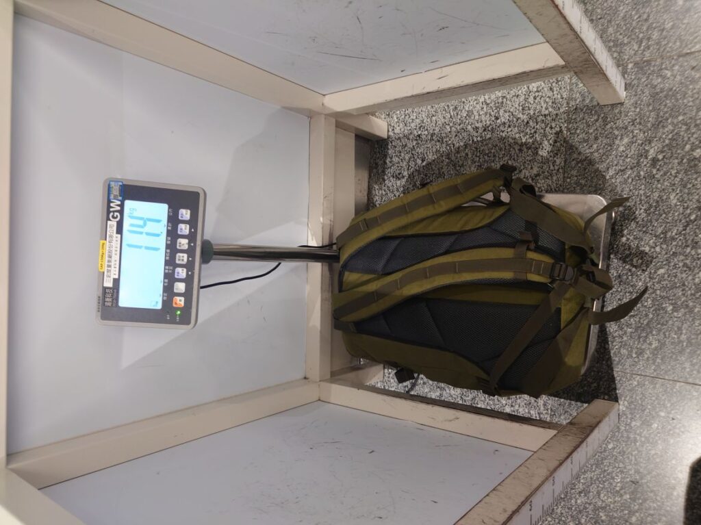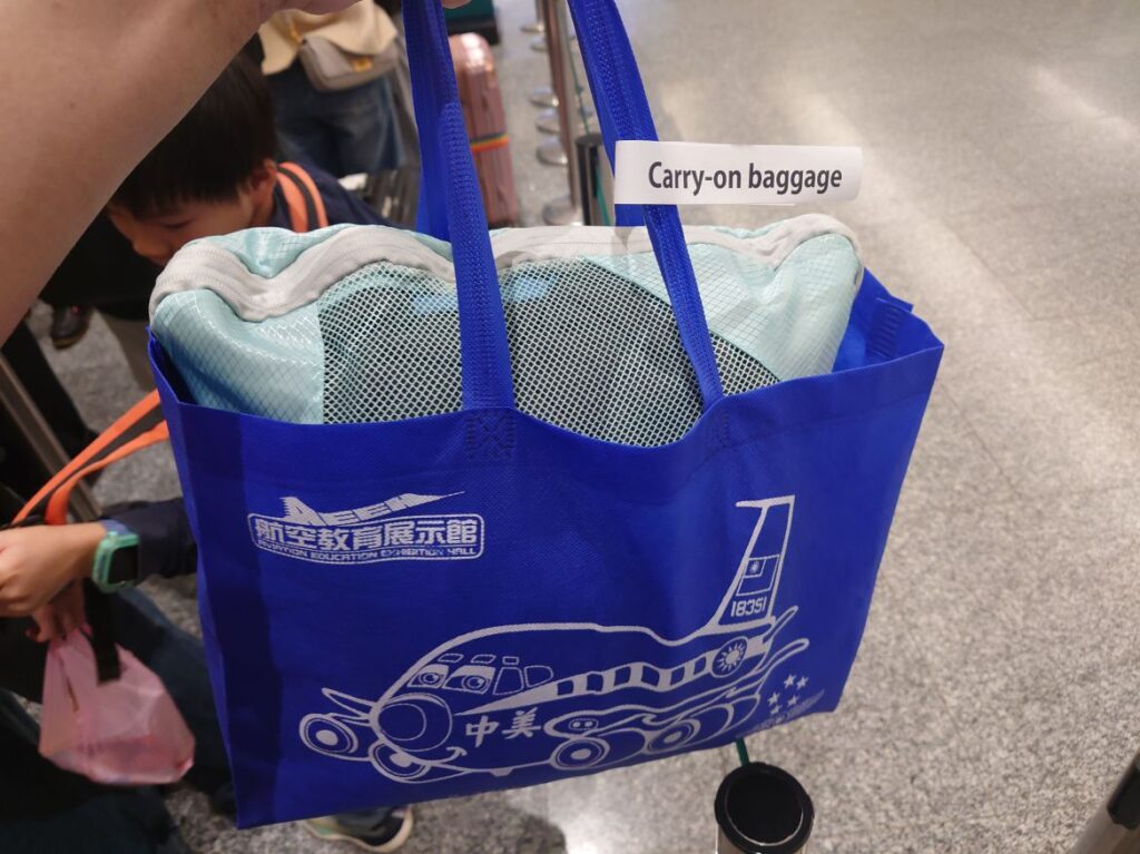 列に並んでいる最中、係員が機内持ち込み荷物に白テープをつけていました。重さ検査はなかったです。高雄の航空教育展示館でもらって袋が役に立っています。