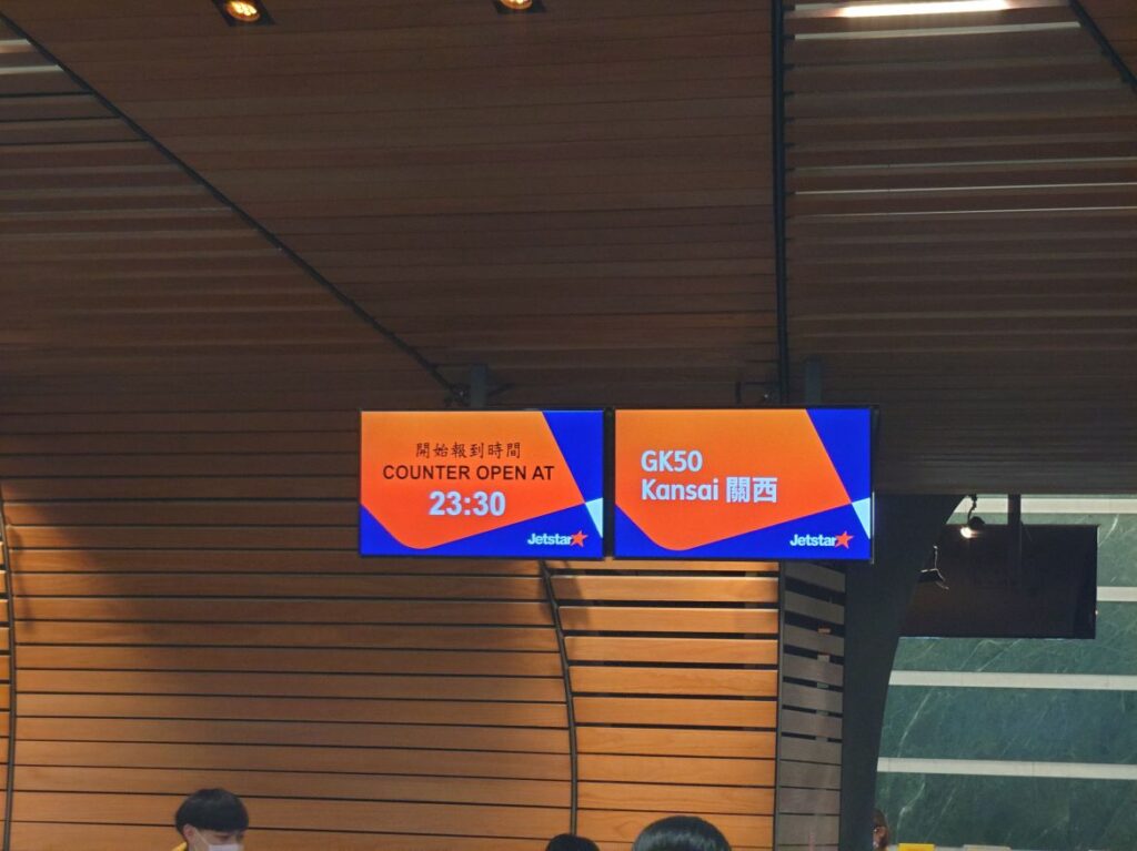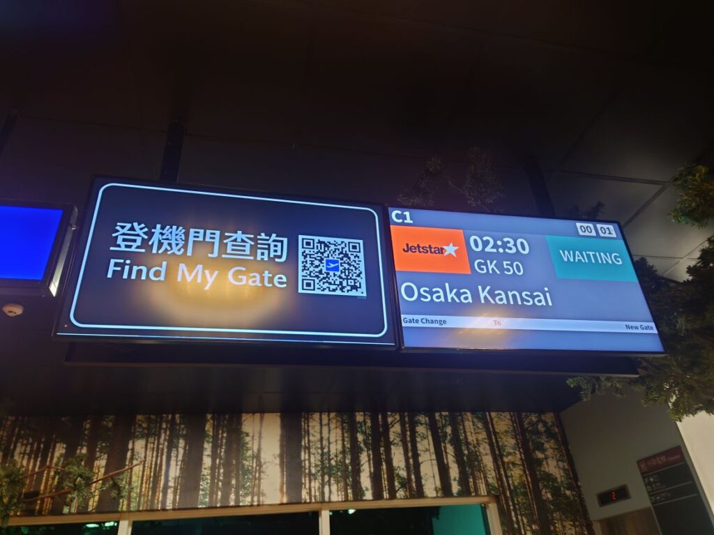 乗れないの確定です。とぼとぼ4番カウンターに行くと別の航空会社の表記があり、ピーチのチケット売り場が見つかりません。電車の中で練った作戦とおり、スマホで桃園空港深夜2:30発関空行ジェットスタージャパンGK50を購入(2人で10万円定価)しました。