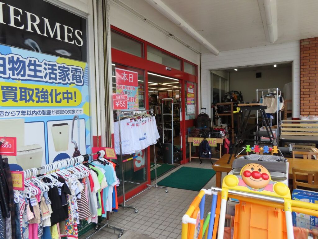店舗入口です。入口の前には商品がたくさん置かれています。