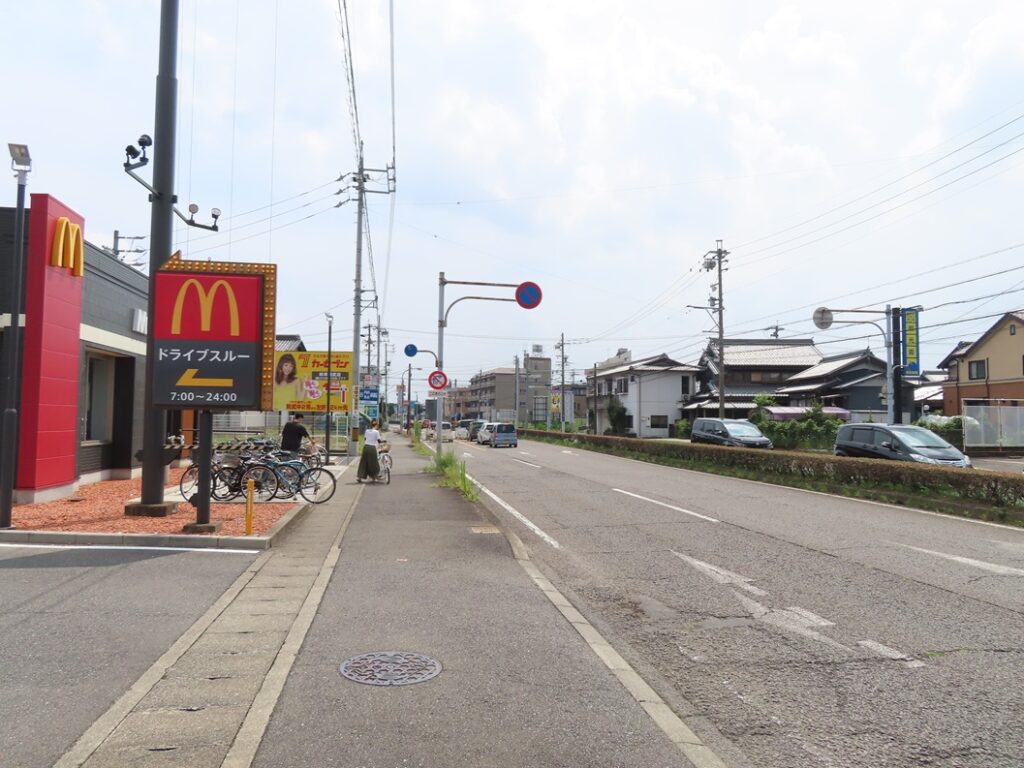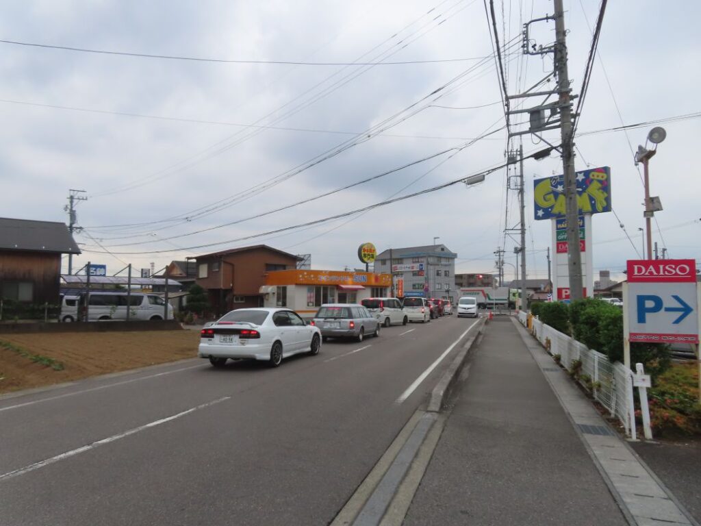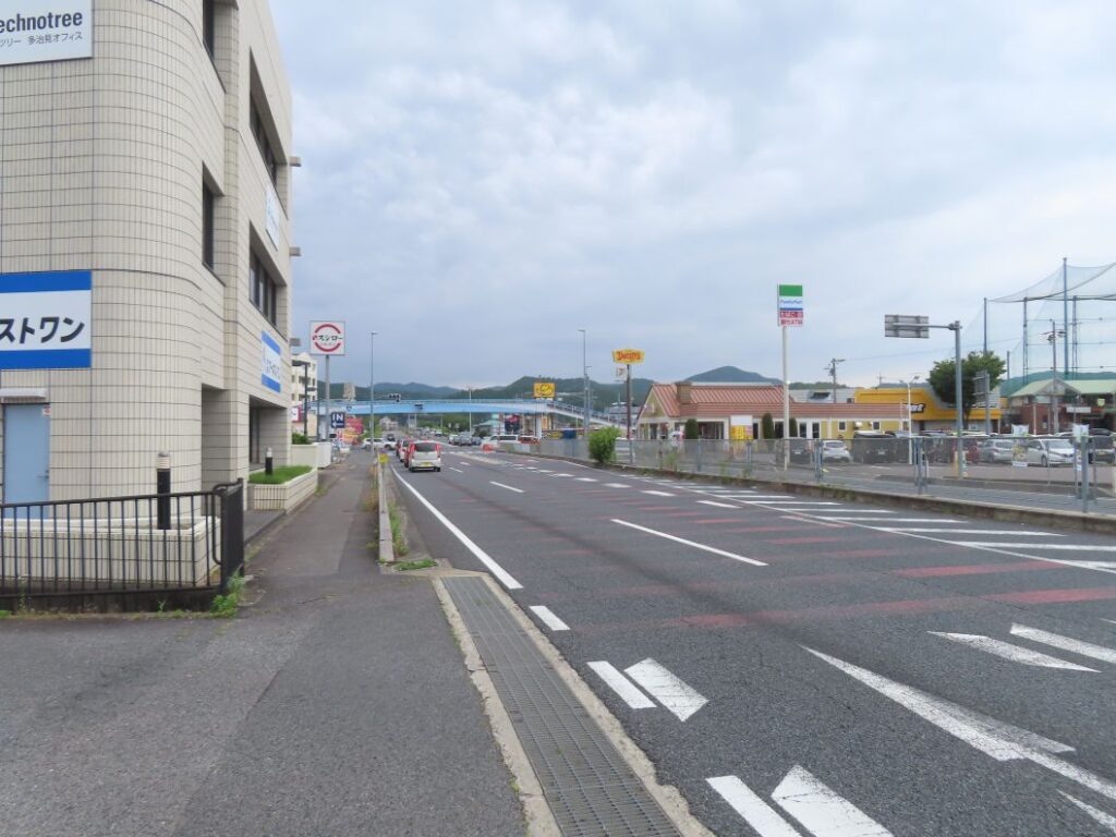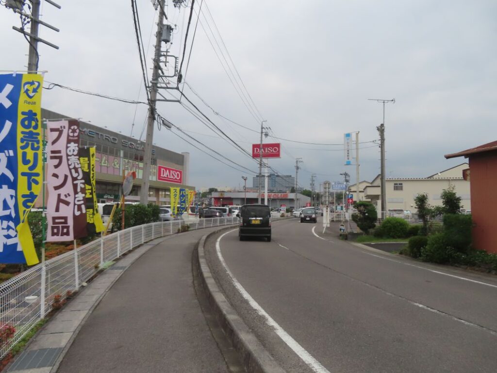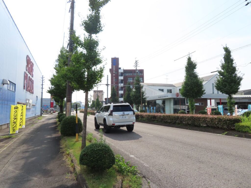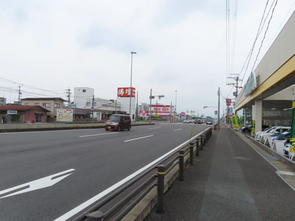 店舗左側、店舗前は4車線の岐阜県道77号線です。中央分離帯があるため、右折入庫はできません。