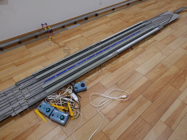 ポイントとホームが近いせいか、新幹線車両の連結部がホーム先端にあたり、連結が外れます。マスキングテープで線路とホームに隙間を開けました。